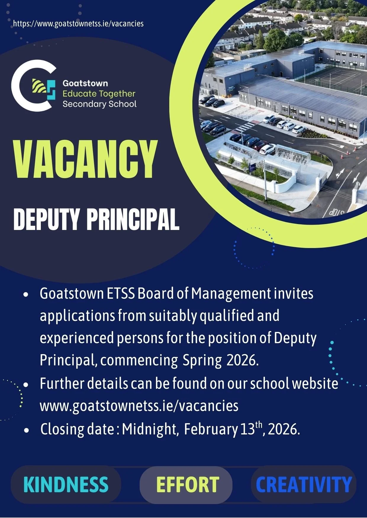 The Board of Management of Goatstown Educate Together Secondary School (Goatstown ETSS) seeks to recruit a deputy principal following the recent appointment of Matthew Quinn as principal.